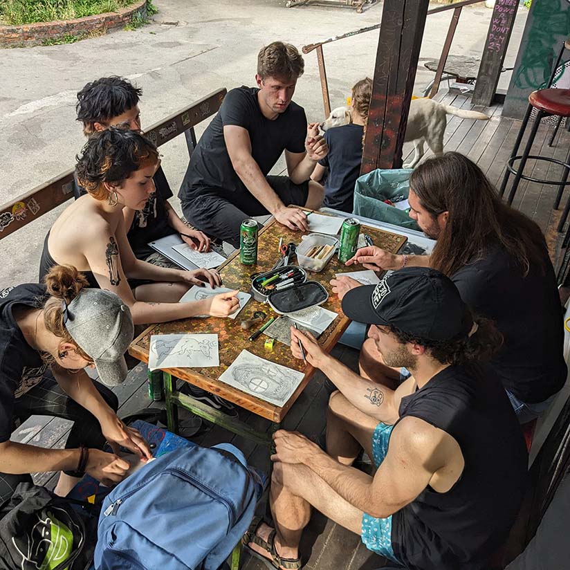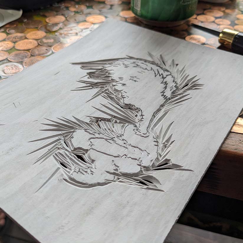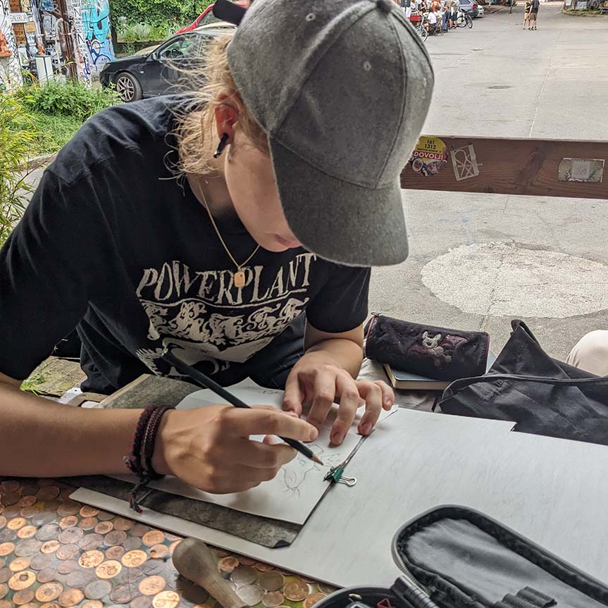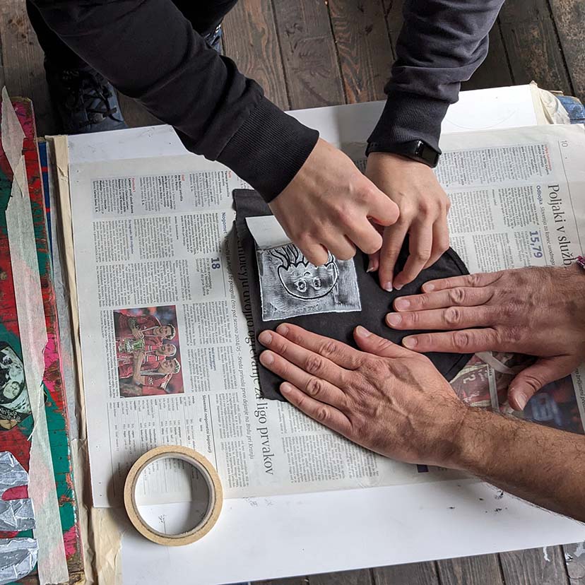 Na delavnici boš narisal_a svoj motiv, ga prenesel_a na linolej, izrezal_a in končno tiskal_a na svojo majico, torbo, hlače, gate oziroma katerikoli kos blaga.